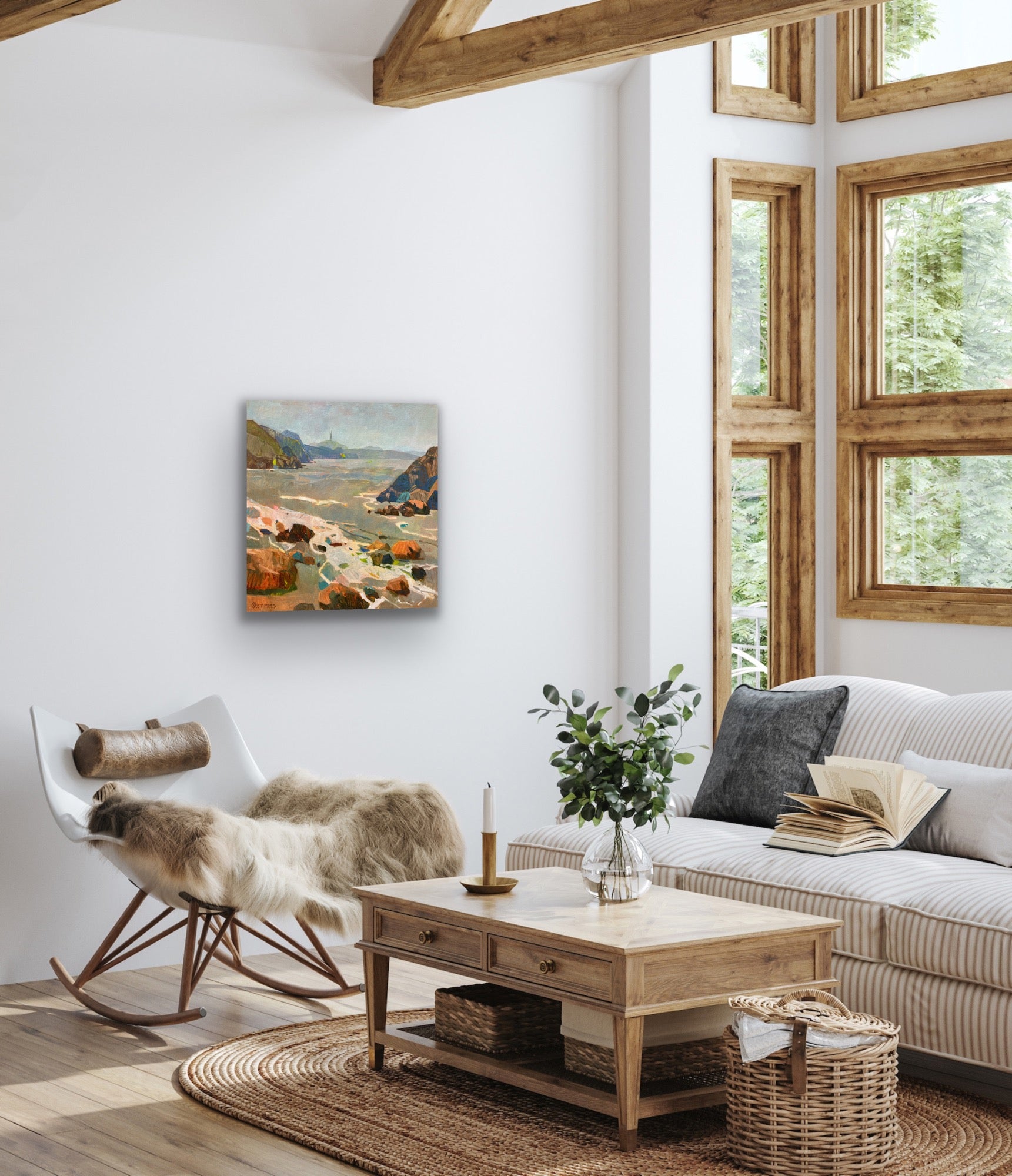 ARTIST NOTES: It is summer. I find a quiet nook to set up paint next to a cliff. The ocean is calm, the breeze is slight. I start to paint and lose track of time. I study rocks and light, shapes and waves. Hours pass. Before I know it everyone on the beach is gone. The wind has picked up and is blowing sand everywhere. When I carry my supplies back to my car I look like a scarecrow breaking free and stumbling across the sand, arms full of chaos. I get stung with sand and the painting gets covered too. There are still bits of sand stuck in my easel today. I always say, you have to be up for an adventure if you want to paint outside!
