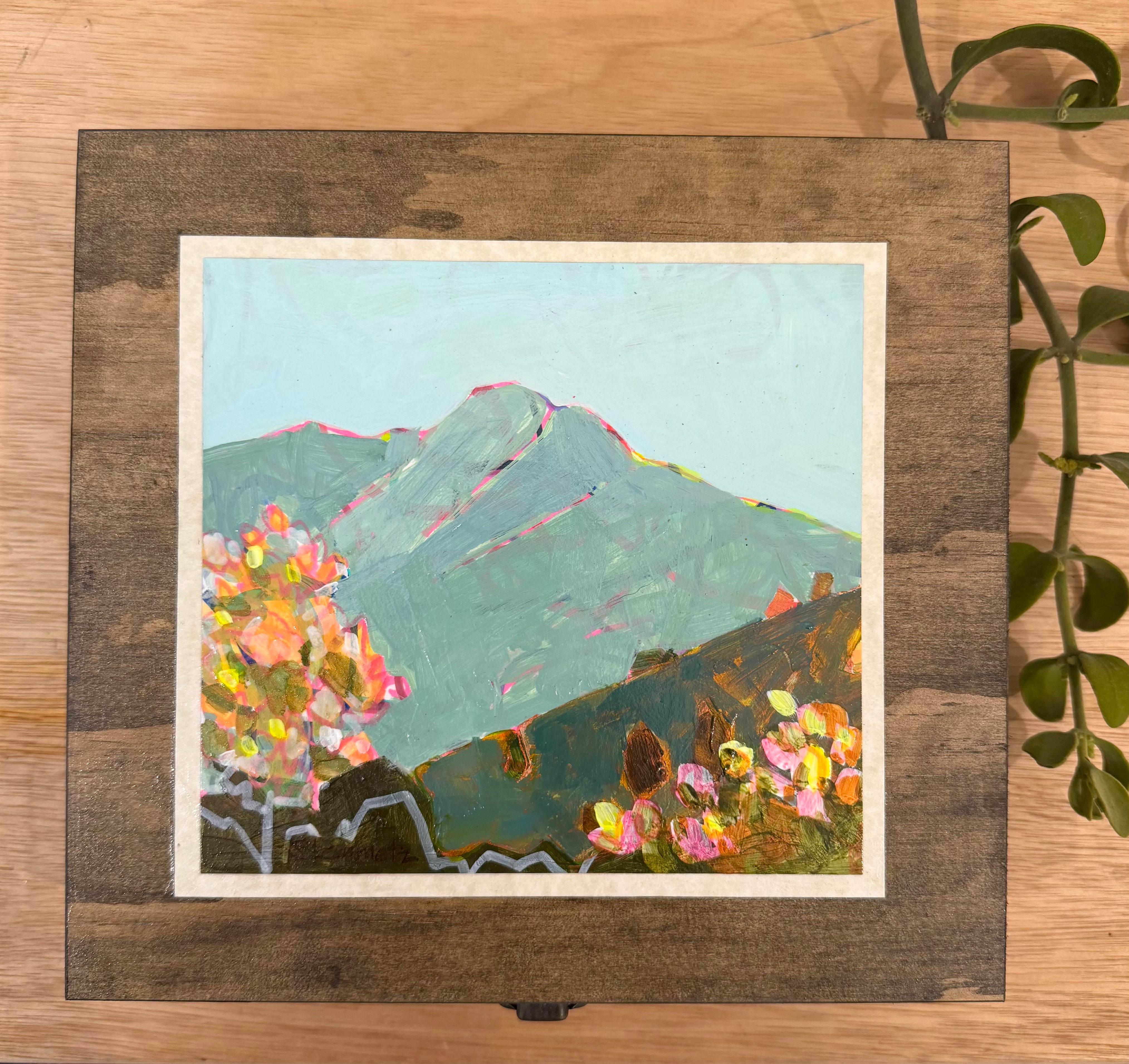 PRODUCT DETAILS: Treasure Box adorned with original hand-painted landscape of Mount Tamalpais from Blithedale Canyon in Mill Valley, California.