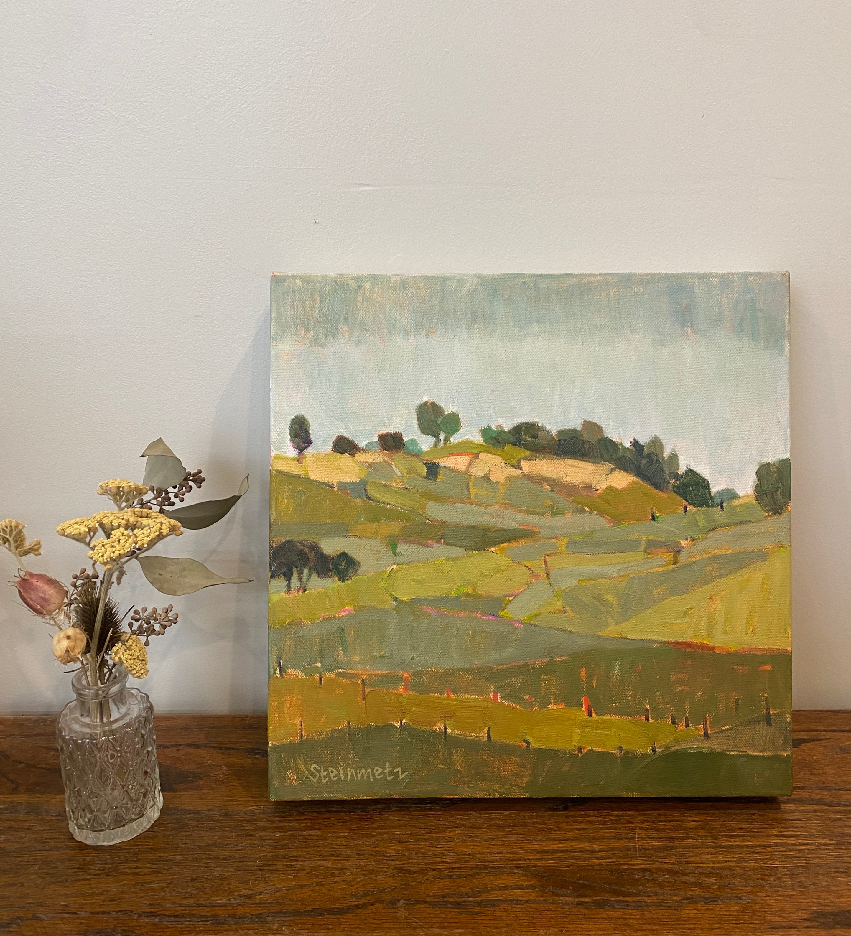 ARTIST NOTES: This Plein Air painting was done in the warm spring time at my friend's family ranch where they have horses in the field, of course they moved too much to make this painting, but their presence was rich.