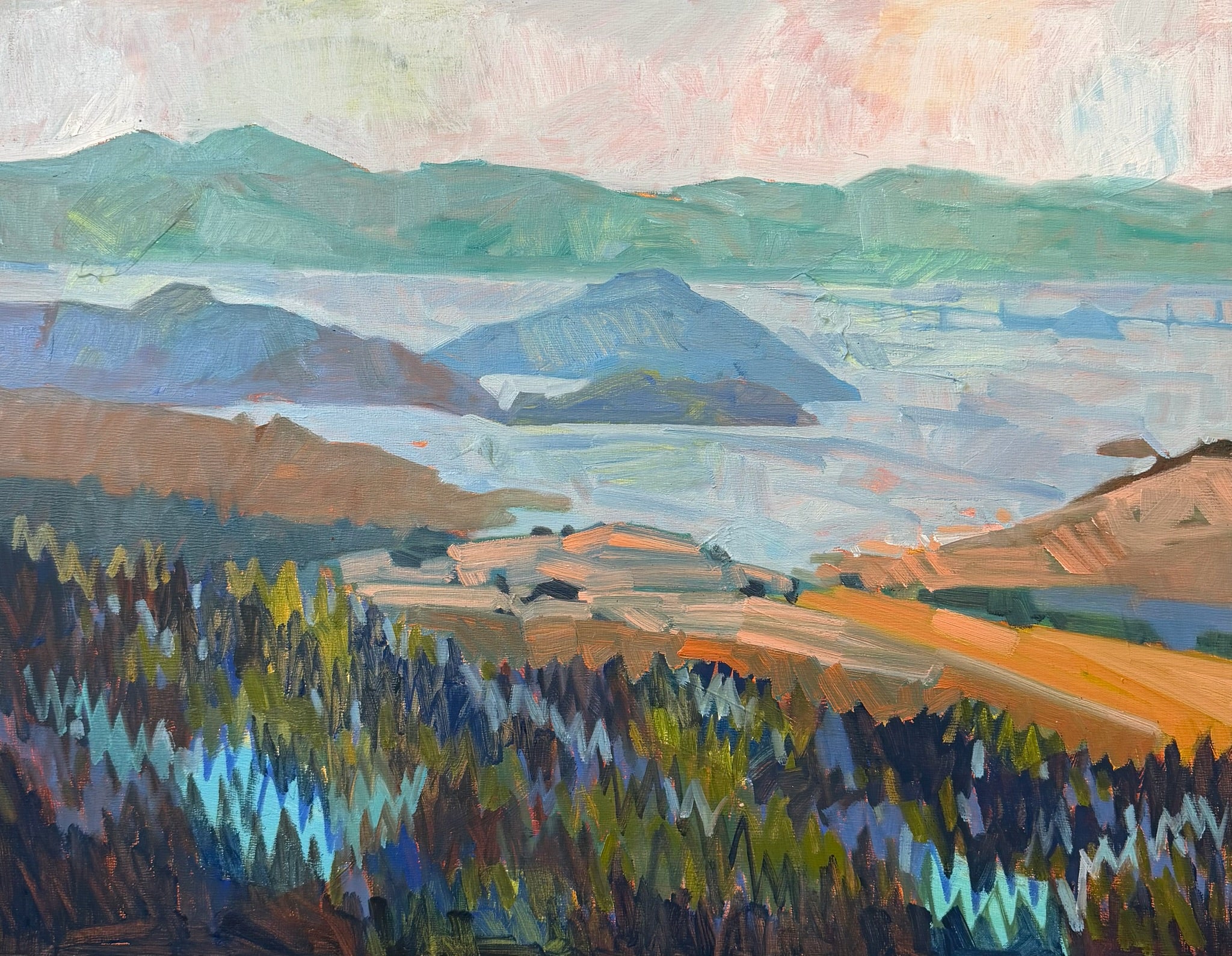 ARTIST NOTES: Sometimes being alone feels so good. Especially outside, on a beautiful day with no place to be. I painted this on Trojan Point on Mount Tam looking towards the East Bay last summer. You can see Angel Island, Tiburon, bits of Mill Valley and the East Bay with the two bumps Mount Diablo at the top left.