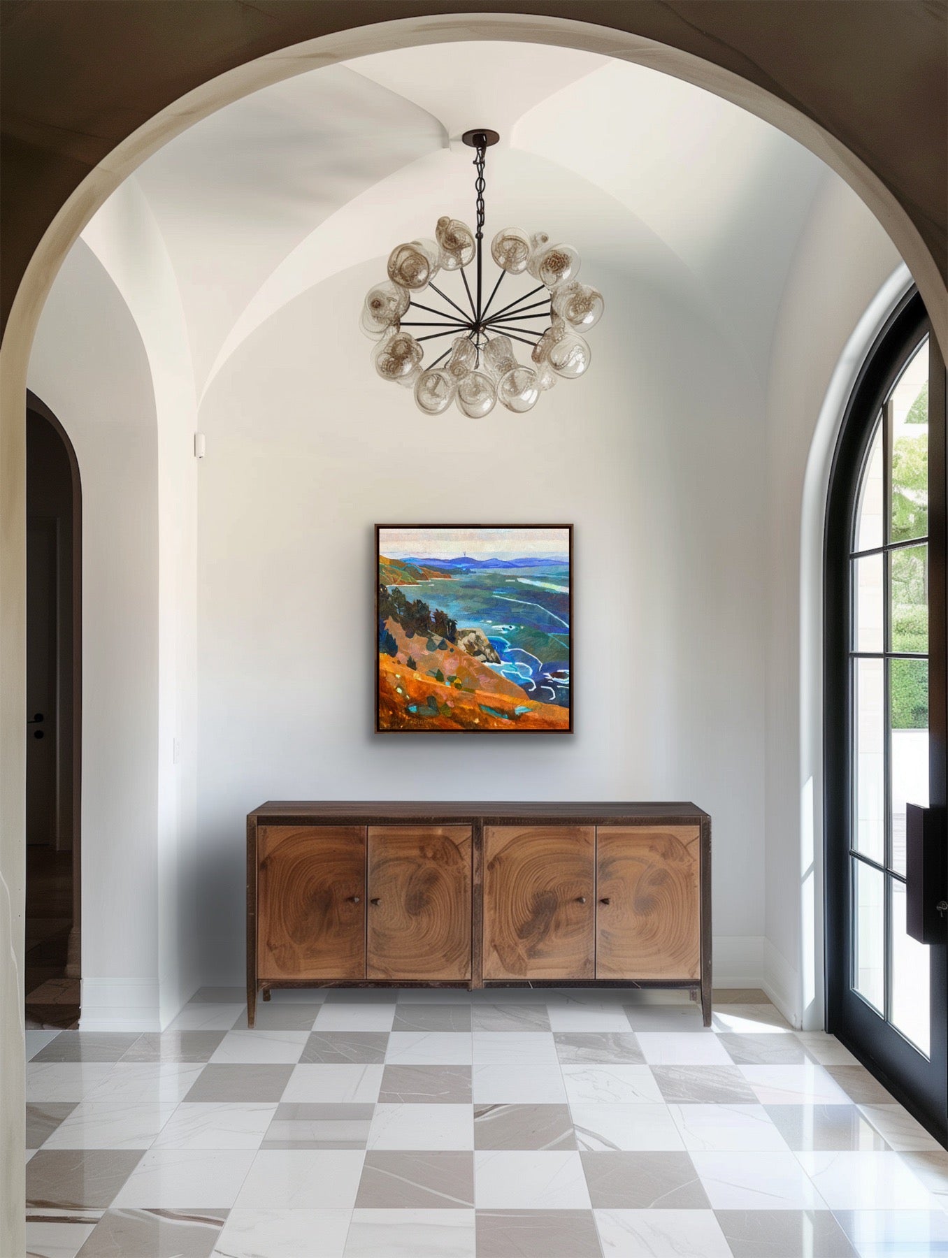 ARTIST NOTES: This is a view from between Stinson and Muir Beaches, looking south at San Francisco. The tower in the distance is Sutro Tower. Of course the cliffs are not that red, and the water isn’t that blue. But when you are out there, looking down at the ocean, and then your eyes float along the contours of the hills you feel a surge of energy. I am not sure why, but you feel like you could sing Elton John and hit all the notes. You could land a back flip or jump off the cliff like a bird and glide down to the ocean safely. It just feels so good.