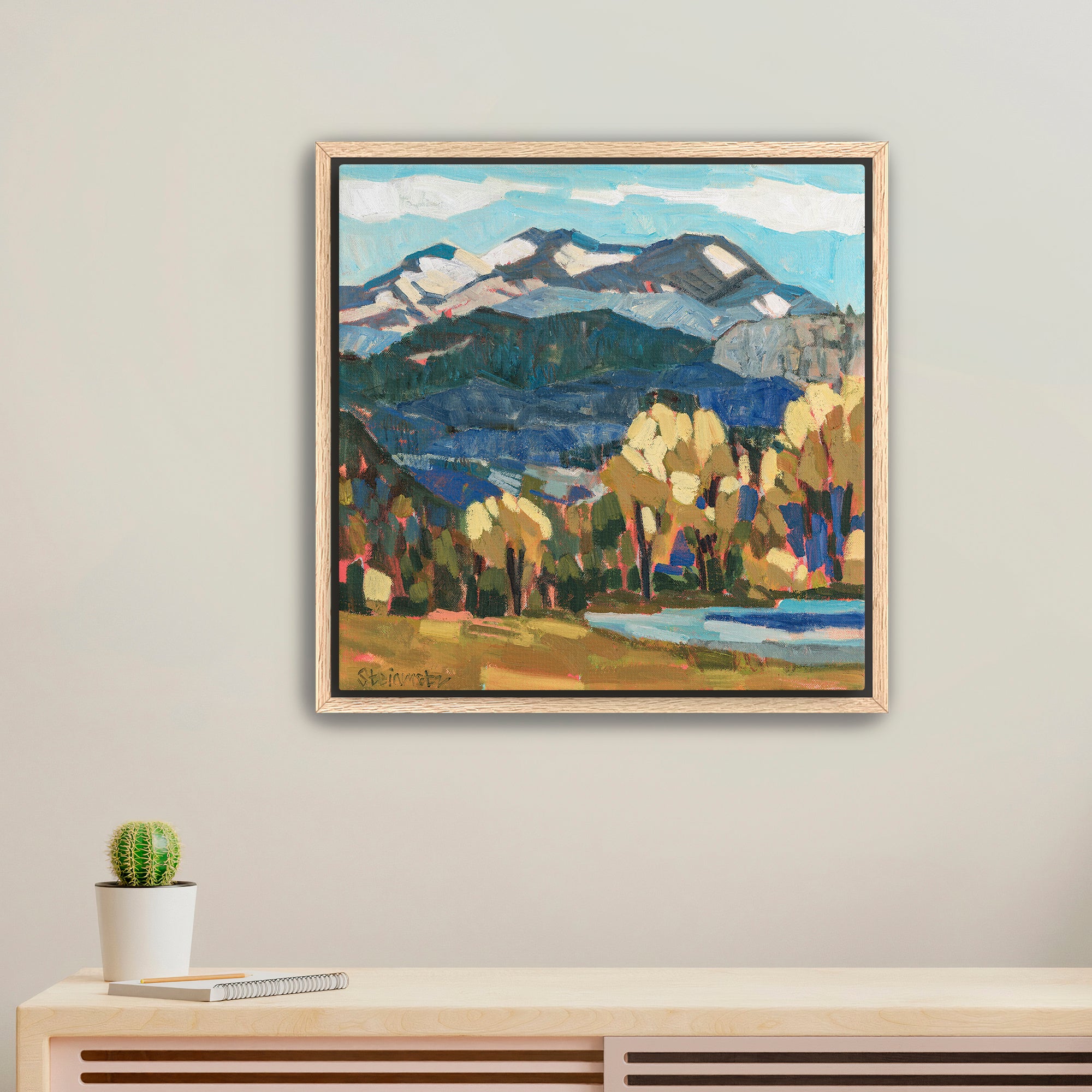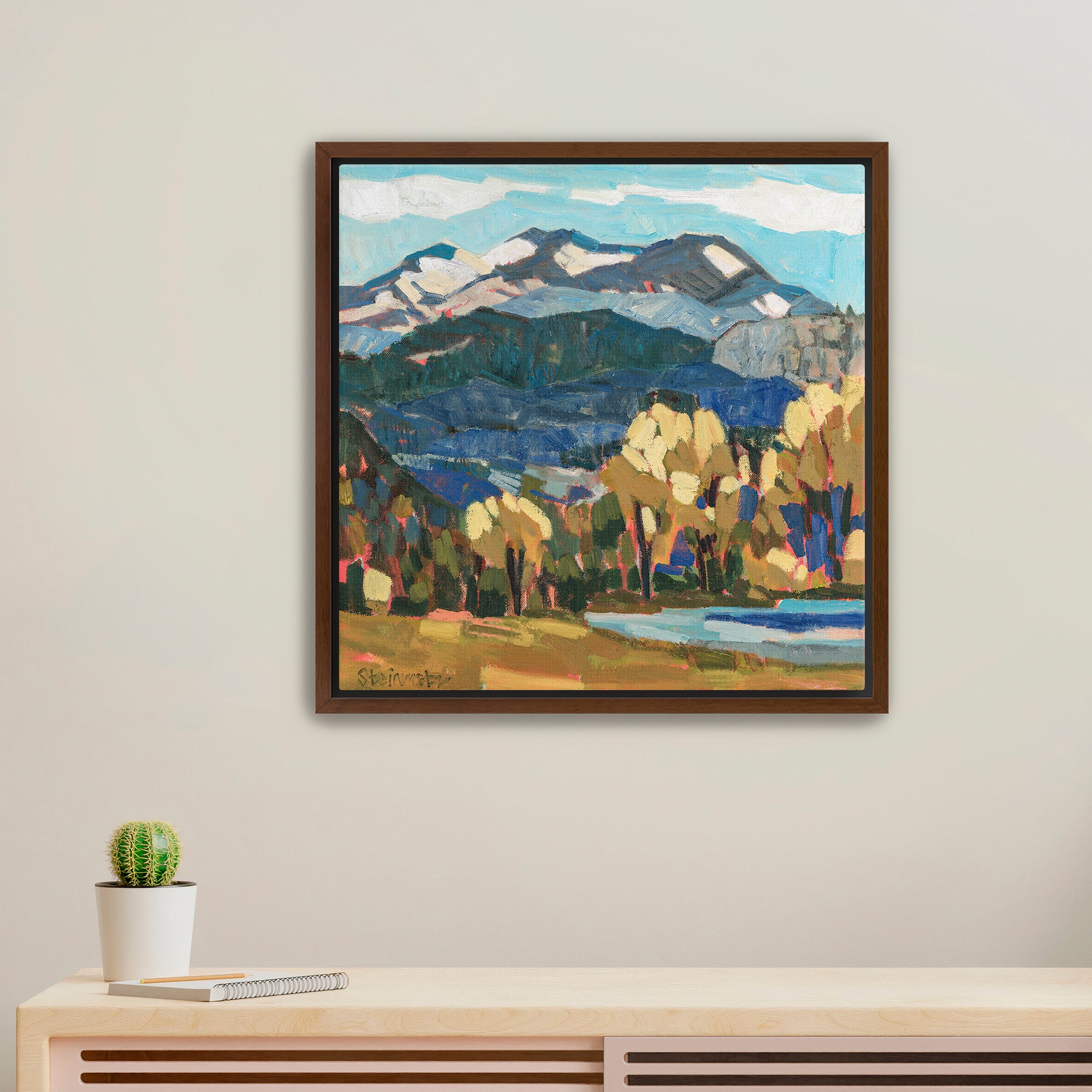 Your choice of a walnut frame around 1.25 inch stretched canvas or an oak floating frame around 1.5 inch stretched canvas.